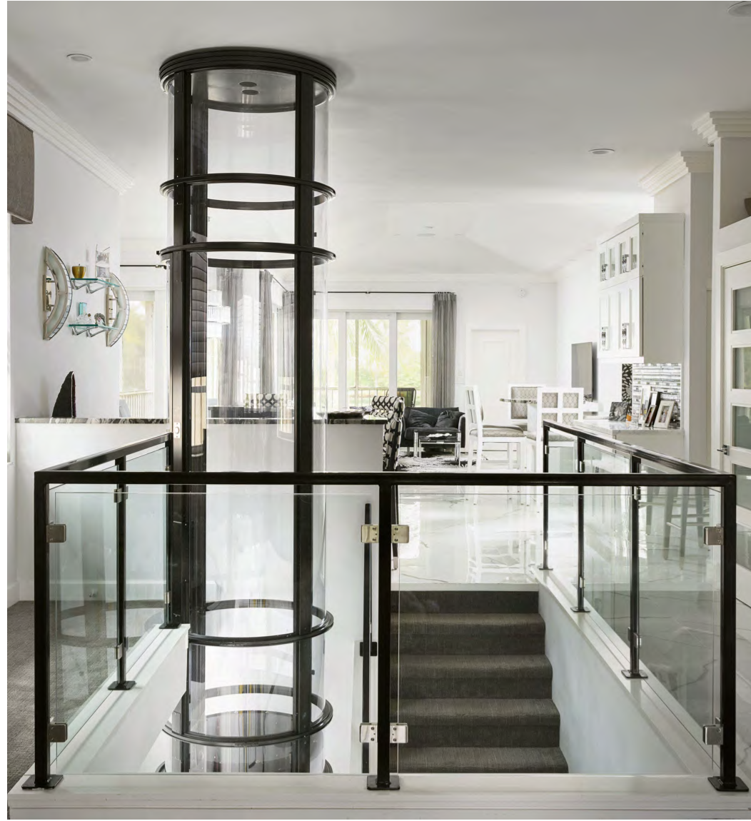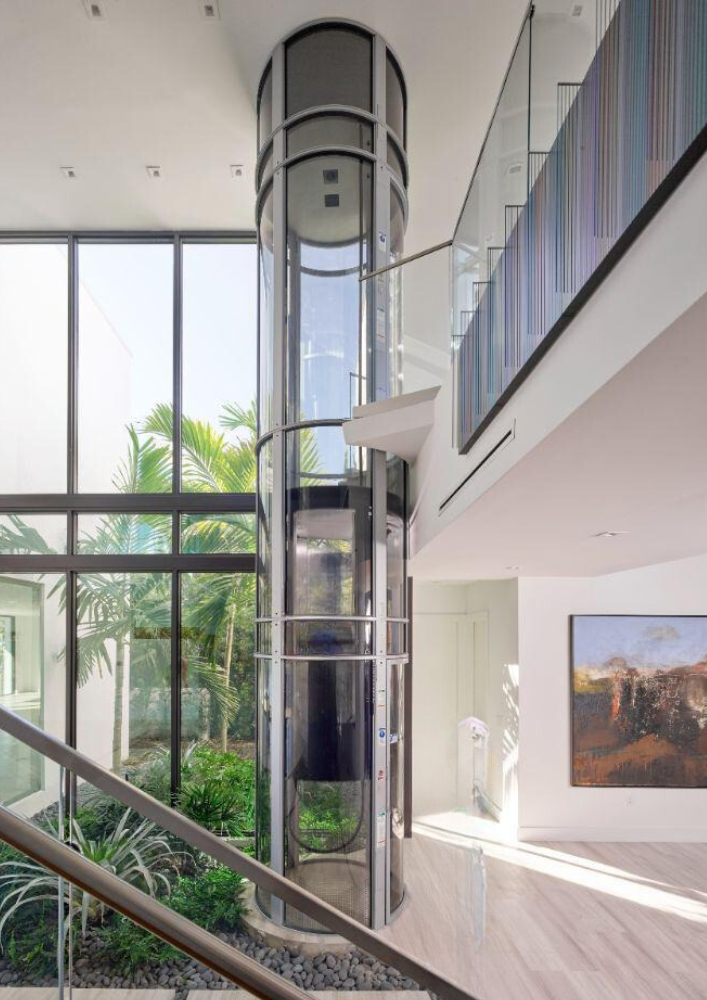 Cet ascenseur est destiné à être installé dans une habitation privée. Il est considéré comme l’un des plus sûrs au monde. Il possède deux systèmes de freinage de sécurité et d’urgence. S’il venait à y avoir une coupure de courant, la cabine descendrait automatiquement à l’étage inférieur pour permettre aux passagers de sortir. L’ascenseur a un design contemporain, sa cabine est entièrement vitrée ce qui permet une commande automatique.